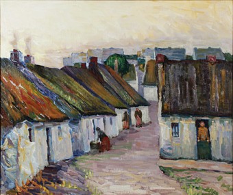 Lamb painted many pictures of Conamara people in their traditional forms of dress, so one would have expected him to be attracted by the red petticoats and blue cloaks of the Claddagh women, or the navy blue jerseys and trousers and peaked caps of their men, but it seems to have been the layout of the cottages there that intrigued him.