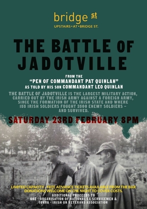 A unique event is to take place in Castlebar on February 23 next when a presentation is made on the Battle of Jadotville from the “Pen of Commandant Pat Quinlan” (Officer Commanding the Irish Troops at Jadotville in the Congo in 1961), as told by his son, Commandant Leo Quinlan.