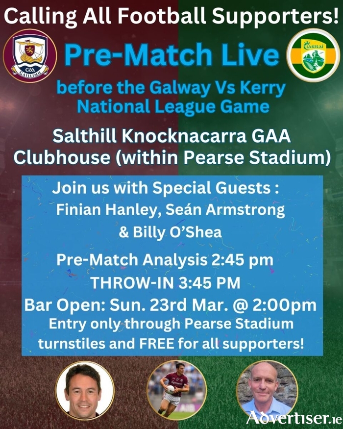 With throw-in set for 3.45pm, the event in the Salthill-Knocknacarra GAA clubhouse (inside the stadium grounds ) will feature expert analysis from football greats from both counties, providing a unique insight into the game ahead. Galway legends Finian Hanley and Seán Armstrong will be joined by Kerry’s Billy O’Shea to preview the match, discuss key battles, and offer their expert take on how the game might unfold.
