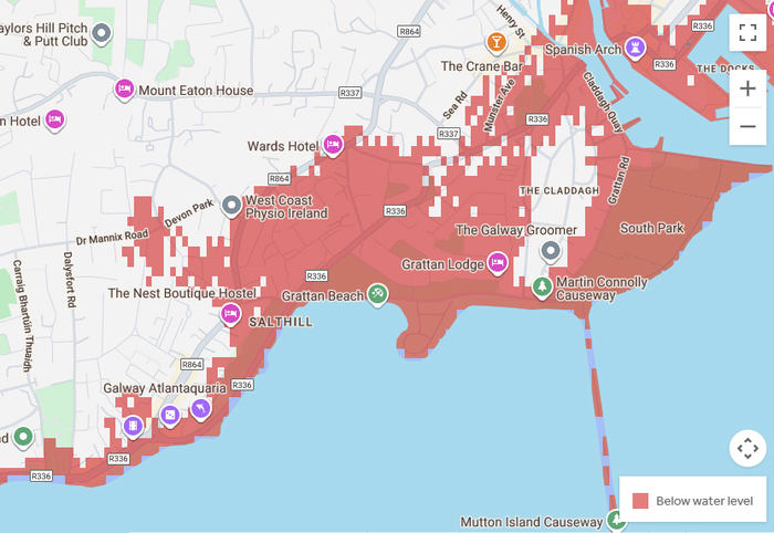 Model imagery of the areas at risk of a 2.5m storm surge or sea level rise in the Galway Bay area (Credit: Climate Central)