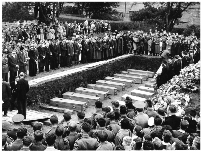 The following day, at about 6pm, a French trawler the Jules Verne was the first of the mercy boats to enter the docks. They were soon followed by another French trawler the Bisson and a Canadian destroyer transferred two bodies and some wreckage into a smaller boat out in the bay. All the boats sailed into the docks with flags at half-mast. The sheer size of the crowd made the situation dangerous as they were leaning over the dockside trying to look in to the boats so one of the boatmen pulled back some of the tarpaulin covering some of the remains at which the crowd recoiled back from the edge and gave them the space to unload their grim cargo.