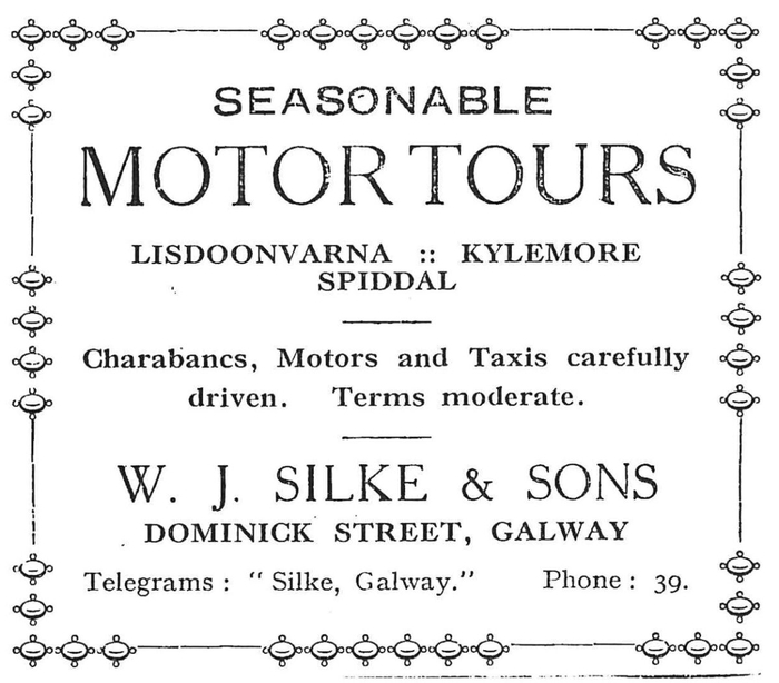 William gradually went into the business of leasing cars and charabancs … a kind of taxi service …. They used to take groups on tour to places like Lisdoonvarna and the Cliffs of Moher – as you can see from the illustrated advertisement. He eventually sold this business to O’Flaherty’s as the grocery business was continuing to expand and soon, they moved the short distance from Pump Lane to William Street West.