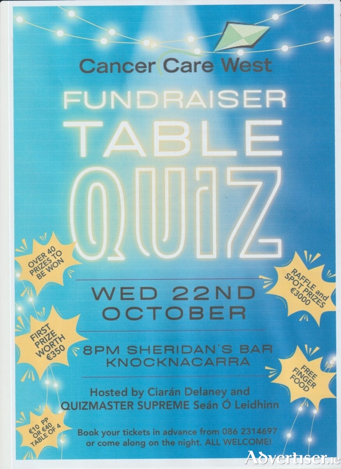 Tom Sheridan’s Bar and Restaurant in Knocknacarra will host a Monster Table Quiz next Wednesday, October 22, from 8pm. The Quiz is part of the fundraising efforts of Ciaran Delaney, whose daughter is recovering from cancer.