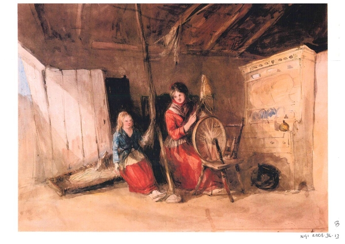 Henry Inglis published his guide A Journey Throughout Ireland in the Spring, Summer and Autumn of 1834 and this book almost certainly influenced Evans. According to Inglis writing on the Claddagh, about 1,700 fishermen lived in this ‘baile’ with their wives and children. “I looked into hundreds of cabins and there was scarcely one in which I did not see the females busily engaged in spinning, making or mending nets. These, they make not only for use, but for sale. An air of decency was visible about them all. I saw none without chairs and bedsteads and a respectable display of crockery.” Many of Evans’ studies of interiors and figure studies were done in the Claddagh area.
