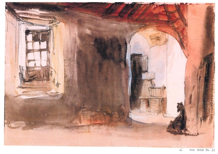 Our final painting by Evans (C ) is of a sparse interior with very little furniture. The thickness of the walls can be seen by the window. There is a fireplace on the right hand side which is why the dog has placed itself there. There is part of a ladder hanging from the ceiling, just behind the fireplace. In the far room, what looks like a washtub perched on a small table, and what may be a dresser in the background there.