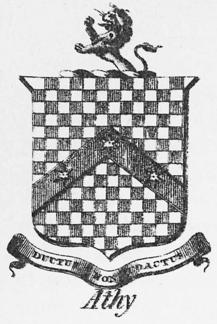 The Athy coat of arms (illustrated ) is described as “Checky, argents and gules, on a chevron of the last, three etoiles, or. Crest, a demi lion rampant. Their motto was Ductus non Coactus.
