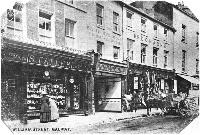 Stephen Faller was born in Germany and came to Galway as a young man. Our first photograph, c1890, shows him at the door of the business he set up in Dominick Street in 1879.