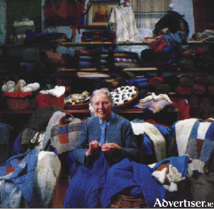 We have two images today, a lady in a Galway shawl holding a pair of socks she may have knitted herself, outside the shop in Dominick Street, dated c1950 and an image of Cis wearing a beautiful báinín, knitting and smiling in that premises.