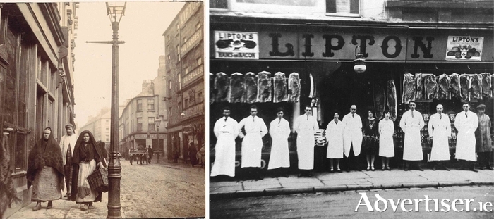 Thomas Lipton was a Glaswegian who used his savings to open his first shop in 1871. Ten years later, he had about 200 shops. He realised there was a lot of potential growth in the market for tea, which was very expensive at the time, so he bought a tea plantation in Ceylon and sold the product at low prices in one pound, half pound and quarter pound packets. He had probably just opened his Galway branch when this photograph was taken, an upmarket grocery shop and delicatessen. They had a trade entrance on Abbeygate Street, an arched double door beside the pro-cathedral which led into the back of the shop.