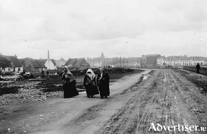 So we have two photographs for you today to show the beginnings of change in the area. The first is a long shot of the Claddagh taken from the seashore which shows you why the area was known as the Swamp. It was subject to the tides which made it very marshy. It was regarded as an encouraging mark of progress that, “With a little bit of improvement every year, it would be made available to the citizens as a profit bearing venue for sporting and other fixtures”. Parts of the field were dry enough for children to play on, and hurling and football matches would have been played there.