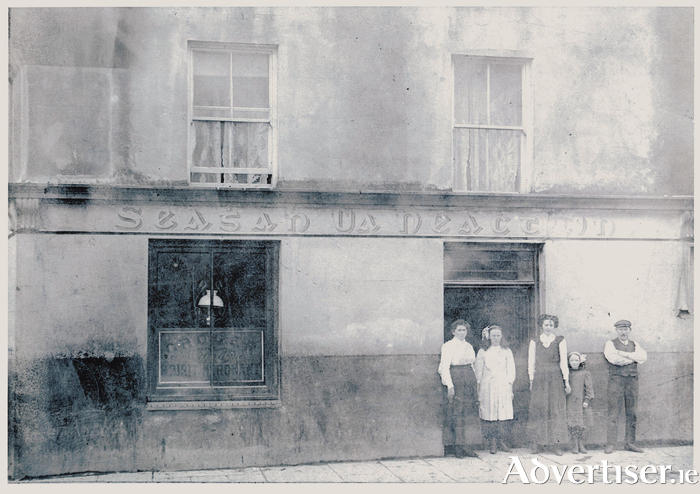 The pub was later occupied by the O’Connor family and was known as The Bear House. In 1894, 130 years ago, it came into the possession of John Naughton from Park, Spiddal and his family have been running it ever since. He married Kate Murphy from Carnmore and they had three children, Paddy, Mary and Sarah. He and Kate were very involved in the formation of Conradh na Gaeilge in Galway. John died in 1904 and subsequently, Kate changed the name over the door to the Irish language version. She refused to serve anyone in uniform and as so many Galwegians had joined the British Army and Navy during World War 1, and as Galway was a garrison town hosting a lot of English troops, she immediately lost most of her customers. It was mostly gaeilgeóirí from Spiddal and Carnmore that kept her going.