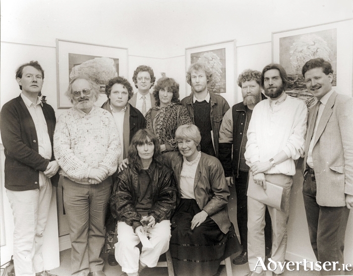 Sponsors were found, letters written a poster (illustrated ) was designed by Tom Taheny and appeared all over town, a reception was held in the Kenny Gallery to announce details of the first festival which, as you can see from our photograph was attended by James Harrold, Michael Mullen, Conor Bowman, Gerald Dawe, Jessie Lendennie, Mike Allen, Eoin Bourke, Fred Johnston and Raghnall Ó Riordan. Seated are Eva Bourke and June Grey Smith.