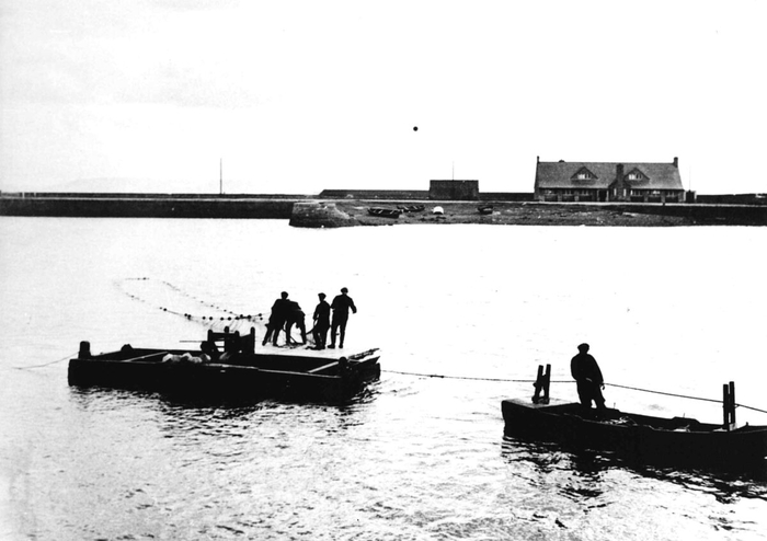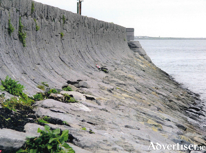 His main priority was to increase the shelter of the harbour by erecting a breakwater along the rocky outcrop known as ‘The Slate’ at the west end of the entrance. It was to be 500 feet long with a return of forty feet at its head, constructed of hewn limestone from Aran with a sloping pavement to seaward, as shown in our first photograph. The work started in 1820 and was completed by 1827, giving the harbour considerable shelter and contributing greatly to its general usefulness. Our second photograph shows part of the breakwater, now known as Nimmo’s Pier c1920. The Claddagh Hall, which features in the photo was built in 1912.