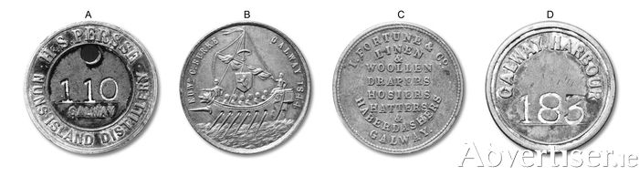 B. Burke’s Distillery: This was located at the lower end of Quay Street where the Leonardo Hotel is today. Edward C Burke was the owner. It had a brief span of life and closed in the 1860s thanks to the opening of the railways which allowed the large distilleries to transport their wares to much wider markets, thus forcing the smaller distilleries out of business. Burke’s was known as ‘The Quarter Barrel Distillery’ and also the ‘Quay Street Distillery’ and their token shows a fanciful adaptation of the Arms of Galway. The ship has been changed to a Man-of-War with a dog’s head figurehead. The tickets were used to pay carters ferrying in grain to the distillery, for every load the carter got a ticket from the gatekeeper. At fixed intervals, the carters surrendered their tickets for money. This avoided an elaborate account system and also the risk of the gatekeeper being robbed if he was using money.