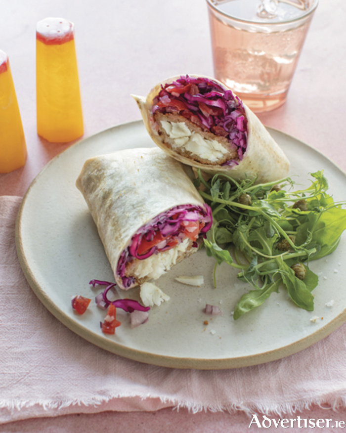 To assemble, warm the wraps in the microwave or in a pan for a few seconds, just to take the edge off then spread with the garlic mayonnaise. Divide the salsa between the wraps and then top with a spoonful of cabbage. Add a cooked breaded haddock fillet, then roll up to seal. Slice in half and enjoy with some extra garlic mayonnaise on the side and a handful of salad leaves.