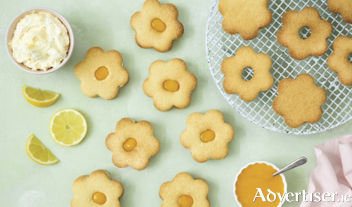 To assemble the biscuits, spread some white chocolate buttercream onto all of the biscuits without a hole. Add 1-2tsp of lemon curd on top of the buttercream and place the biscuit with the hole on top.