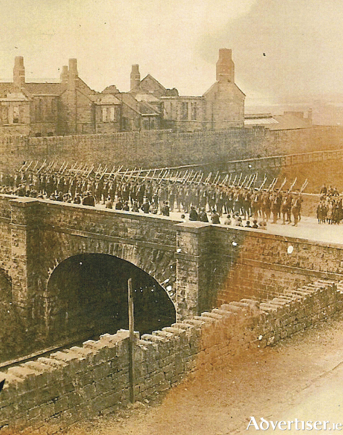 A short time later, the National Army took possession of the complex. Our photograph today may well be a record of that event. You can see a unit of the army lined up on parade on the railway bridge in front of the barracks. They are being watched by members of the public. In the background you can see the remains of some of the buildings ruined by the fire. In 1936, the barracks was fully rebuilt by H McNally and Company from Market Street.