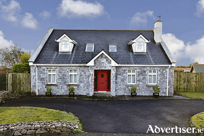 Side access via a gated fence leads to the large south facing garden with beautiful views of Galway Bay and the Clare hills. The boundaries are defined by natural stone walls and mature shrubbery. There is a large patio area suitable for outdoor dining and two large garden sheds.