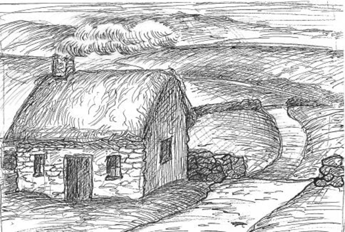 We parked the car and toured the church again, and as I sat in one of the pews I imagined: if my ancestors had lived somewhere on that winding, nameless, one-lane road, they could have made the three or four-mile journey in a horse-drawn cart to go to Sunday Mass at Saint Columba’s. My imagination kept going and picked a spot on the road, about halfway between Connolly’s and Duffy’s. Then the Bodkins’ thatched roof, two-room cottage appeared to me, and the prologue of Briarhill to Brooklyn began with the family crowding around the table in their Briarhill home, and the children’s mam saying the family had to go to America.
