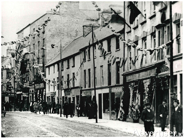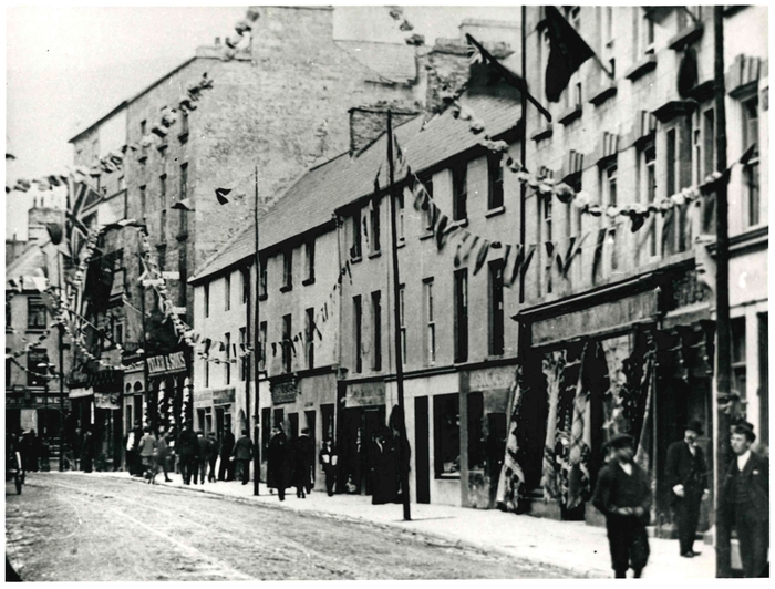 Our second photograph is from a glass plate slide, dates from 1903 and shows Shop Street decorated for the visit of Edward VII. Cunningham’s butcher shop is the dark façade just past the middle pole. Among the other businesses on the street at the time were Donnellan’s, Commins and Greaney, Brennan’s (with the shawls hanging outside ), Hardiman’s, another branch of Brennan’s, Carney’s pub and bun shop, Talbot’s Saddlery, Tyler’s shoe shop, Toner’s betting shop which was always a barber’s shop, Johnny Egan’s Pork Butchers and the River Plate Meat Company which occupied the end building.