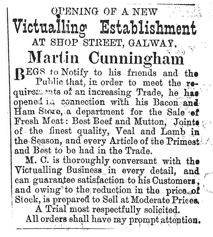 Martin Cunningham ran exactly the same advertisement in local newspapers over a number of years between 1899 and 1902. A sample of it, published in 1902, is illustrated here.