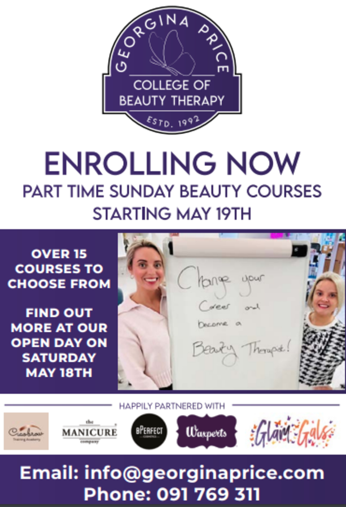 Those interested in a career in beauty therapy are encouraged to attend the Georgina Price College of Beauty Therapy's upcoming open day on Saturday, May 18 at its premises in Liosbán Industrial Estate.