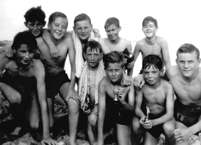 If you grew up in or near Salthill, you probably spent most of your time either at ‘the Ladies’ or at Blackrock. Our first photograph (courtesy of Éamonn Ashe ) shows just such a group taken in 1950. They are, back row; Richard Walsh, the canal; Seán Walshe, the Stella Maris Hotel; Christy O’Connor, O’Connor’s Bar; Seán Ashe, Salthill; Tom Walshe, Stella Maris Hotel. In front are Padraig Walshe, Stella Maris Hotel; Bernard ‘Tiny’ Jackson, Shantalla; Michael ‘Skipper’ Donoghue, Salthill; Éamonn Ashe, Salthill; Tony O’Connor, O’Connor’s Pub.