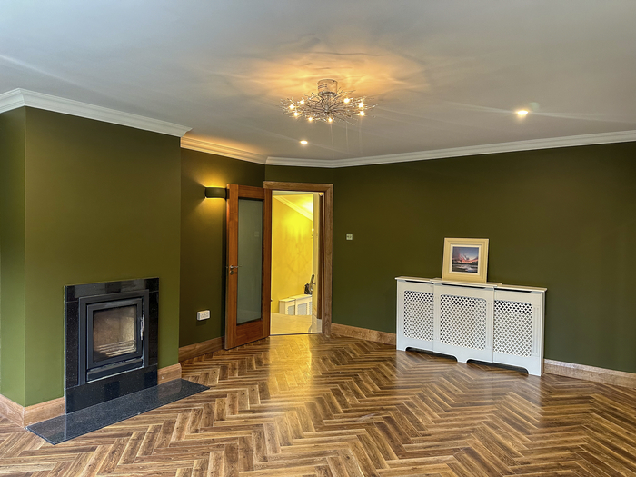 Just off the dining room is the main hall, which leads to a large rear living / family room with solid fuel inset fireplace. The main hall is beautifully finished with herringbone style timber floor.