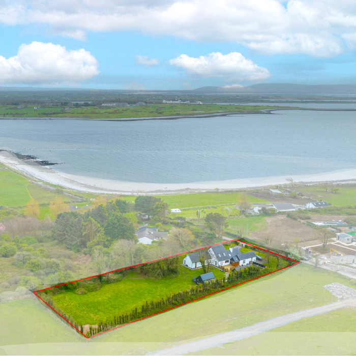 The rear west of the property has new decking, allowing for late evening sunshine and is located just off the kitchen, with the long rambling gardens in full view. There is also a large rear workshop/shed, that was constructed with the house and is of the same quality, along with a greenhouse also on the circa 1 acre of mature landscaped gardens. It is also within 140 metres of a pebbled Galway Bay shoreline.