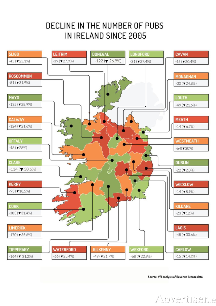 The stunning figures are part of a nationwide drop of 2,000 pubs which have shut their doors in the past 19 years. Author of the report, Prof Tony Foley told the Advertiser that the cost of maintaining small, family-run businesses in rural areas of counties like Galway is often unsustainable.