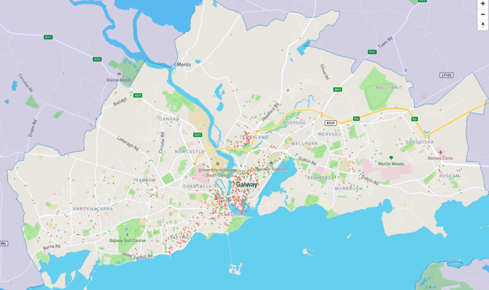 The map of AirBnb listings currently available for short-term let online in Galway city. Marked in red are listings that are an entire property. Image taken from Inside AirBnb's website.