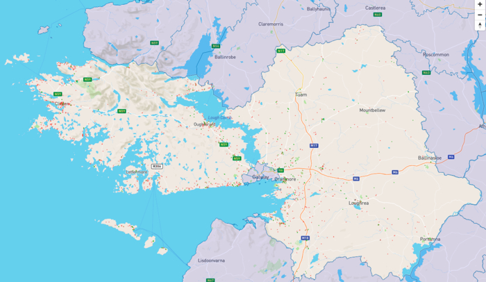 The map of AirBnb listings currently available for short-term let online in Galway county. Marked in red are listings that are an entire property. Image taken from Inside AirBnb's website.