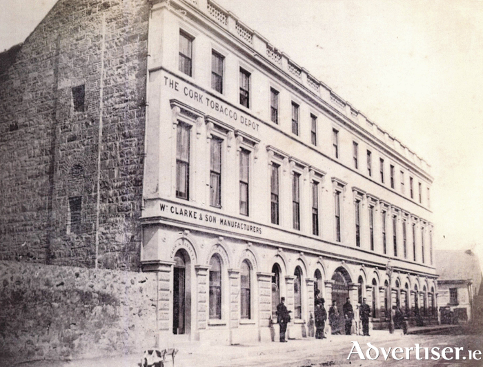 Our drawing was made by Mr Austin Semple, the builder from Galway. It was published in the Dublin Builder on November 1, 1866. Our photograph of Eglinton Street façade was taken just a few years later, and it would seem the plan for at least one house at the end was abandoned as it was taken over by the Cork Tobacco Depot, Clarke & Son, manufacturers. This later became Casey’s Cigar and Wine Store. The photograph was given to us by Chetham Library, Manchester.
