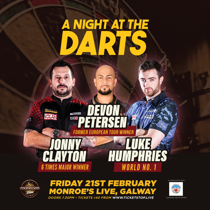 Tickets for A Night at the Darts on Friday, February 21, at 7:30pm at Monroe’s Live are €40 and can be purchased at www.Ticketstop.live and through the www.monroes.ie website.