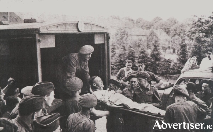 In 1976, Joyce’s daughter, Mrs Heather Iandolo, had his remains brought back to Galway and he is interred in the new cemetery. Our photographs show Joyce arriving at Army Headquarters just after his capture, and his wife Margaret after hers.