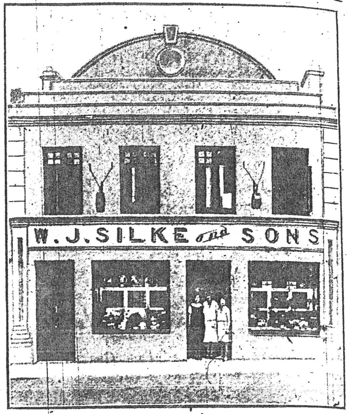 Our photograph was taken c1920 and shows William on the right, his daughter Tess in the centre, and four unidentified men, two of whom may have been his sons. The end part of the building (with WJ Silke written on it ) was originally a store for the Pump Lane shop. They knocked the part of the building (where you see & Sons ) and built a ‘palatial new premises’ seen in our second photograph, designed by Mr M Sarsfield and built by PJ Finnegan, contractor, Salthill, which housed their high-class wholesale business in confectionery, fruit, tobacco, sweets etc. This opened in September, 1931. The family lived upstairs.
