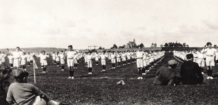 In the 1930s, the Bish organised drill displays here. Sergeant Brennan was the drill master and everybody brought a penny for him. For one drill you had to stand to attention, on the command of “A h-aon” you had to raise your left arm 45 degrees. On the command “A dó” you held it straight out, on “A trí”, you raised it another 45 degrees. This was then repeated with the right arm. What many of the participants remember about the proceedings was the new elastic striped belt with the S-hook. As you can see from the photograph, it would appear most of the school was involved.