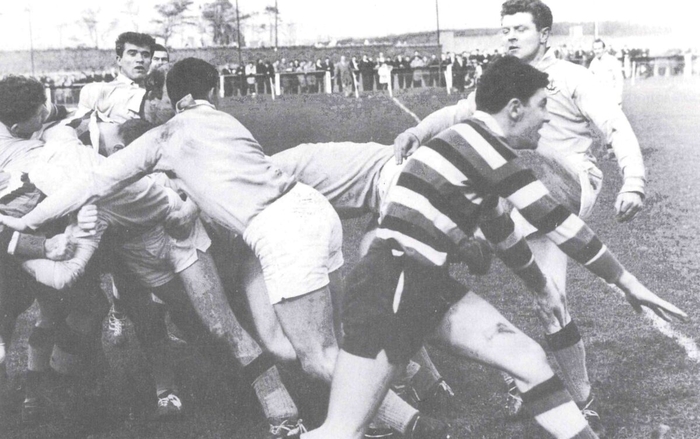Photograph (C ) is of the Galway Show c1960 and includes, among others, Pat Crowe, Tom Fahy, Peter Griffin with a dairy cow, Michael Dunne, Tom Clancy, Pat Kenelly, Martin Divilly, Frank Cosgrove with a cow, Paddy Fahy with a cow, Peter Codyre, Luke Small, Pat Broderick and Danno Fahy. Photograph (D ) is of spectators at a rugby game in1970 and picture (E ) is of Paddy O’Gorman who worked at the greyhound track for nearly 60 years. Our final image (F ) is of a rugby match between two great city rivals in the 1960s showing wing forward Mick Hackett (Corinthians ) blocking a clearance by scrumhalf Danno Heaslip. Notice the crowd in the background, a sight we will never see again after this weekend.
