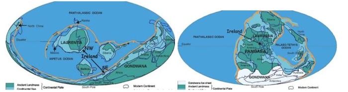 To start we’ll travel back. Before Pangea, 570 million years ago, we had Gondwana and Laurasia. This was called the Cambrian Period. Ireland was split in two. The north west (including Galway ) was part of Laurentia; part of the northern supercontinent Laurasia. And the south east of Ireland was part of the southern supercontinent, Gondwana. Laurentaia formed a large part of today’s North America, Canada, Greenland, Scotland, and Ireland.