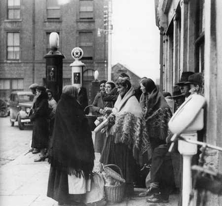 There is a wonderful mix of the modern and the traditional in this photograph which was taken at the corner of Eyre Square and Rosemary Avenue in the mid 1930s. The woman in the foreground is wearing a plain black shawl, a petticoat and a ‘práiscín’ which was a heavy canvas apron worn to protect the skirt. Two others are wearing beautifully patterned shawls which must have looked very elegant and colourful. They had probably come into town to sell their wares, and then went shopping with the proceeds, and their baskets are now full. The other women in the picture are all dressed in more ‘up to date’ coats and berets. It looks as if all of these people are waiting for a bus.