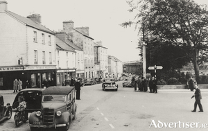 Our first photograph today (courtesy of the National Library) is a bird’s eye view that was taken in 1953 and shows the Warwick Hotel at the top of the picture. Next to it on the right was the entrance to Lenaboy Park, and beyond that you can see part of Queeney’s shop. Next door was Doorley’s private house and then Mrs Turke’s B&B called Osterley Lodge. Opposite, on the far side of the road was Billy Binn’s house and on the corner, as you can see, was a field with a lot of trees, much used as a playground by local children. This whole area was very prone to flooding and was occasionally rendered impassable, as was the case with Hurricane Debbie.