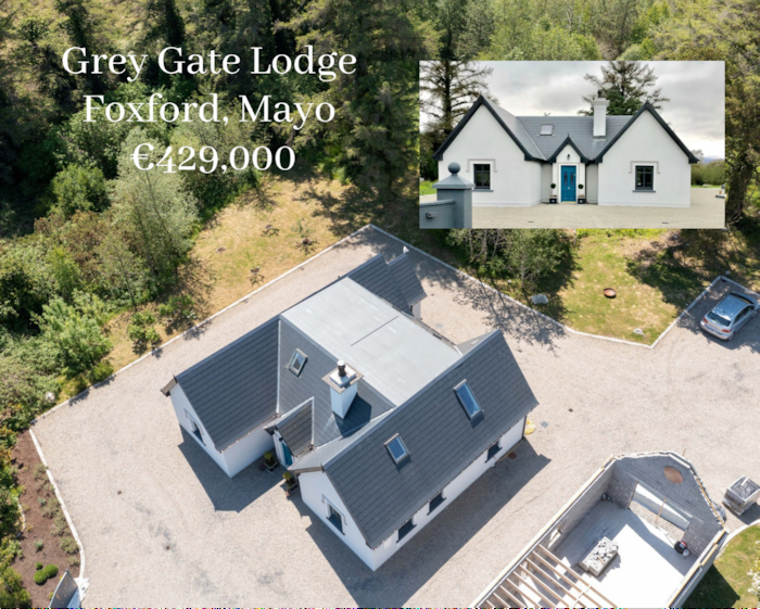Grey Gate Lodge is a luxurious, charming, Victorian Gate Lodge style modern home offering four ensuite bedrooms, 4.5 baths, custom kitchen, butler’s pantry, vaulted open-plan living room, dining room and an office to work from home! Designed and completed with superior finishes in 2020, this high-end, custom property has much to offer, evident in every unique detail. It is a highly efficient home of 194 sq m with minimal overhead (a rare rating of BER A3 ). It would be an excellent family home or investment property (as a boutique B&B or rental property, it has a 5* Google and Superb 9.4* Booking.com rating! ). The property has new planning-approved for a studio with insulated foundation and walls completed – ready for buyer to finish as a separate office, studio, guest space or garage/workshop. Positioned in Foxford on seven acres, it is a short walk down a country lane to Foxford town, train, excellent Foxford schools and Woollen Mill. It is in easy reach of Lough Conn and the River Moy for local fishing, biking and local hiking trails and is a short drive to the coast to locations such as Connemara, Achill, Westport, Enniscrone and more. Grey Gate Farm offers organic vegetable and wildflower garden, new greenhouse and shed, extensive parking and open farm-land. Beautiful woodland views from every window. For more information contact Karen Mackay on (087 ) 4387456 or email: [email protected].
