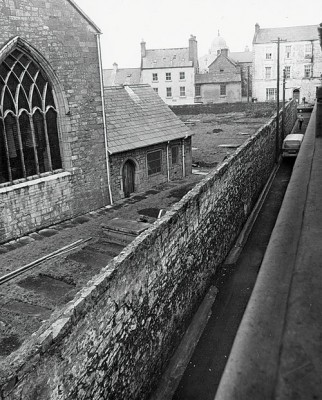 Church Lane was a dark place up until 1983 because of the very large high stone wall that ran the length of it. This was part of a wall that was built around St Nicholas’ Collegiate Church and its adjoining graveyard. The removal of most of the wall and its replacement by the railings that once surrounded Eyre Square was one of the earliest ideas for improving Galway as it prepared for the Quincentennial in 1984. This project transformed the area around the church, making it much more attractive and opening it up to the passing public. It let a lot of light into the city centre.