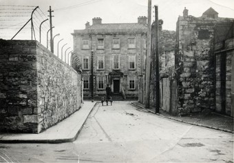 This photograph of Cross Street was taken in 1946. Early maps of the city show an open air altar at the end of the street. It was built by the Dominicans and used for various processions and Corpus Christi. The building facing us is Mayoralty House which was originally built in 1793 for a member of the Daly family. This family exclusively held the office of mayor from 1776 to 1816. It was probably built by James Daly, who was mayor in 1804, 1810, 1814, 1818, and 1819. The Dalys owned the house until the late 1840s. In Griffith’s Valuation in 1855, there is no mention of Mayoralty House, but a house fitting its description belongs to the Town Commissioners. These had replaced the mayor and corporation about 1935. It was later used as a police barracks.