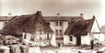 This photograph was taken in the 1930s and illustrates the huge difference between the old thatched cottages in the Claddagh and the new houses that were being built to replace them. Even though the area was a building site with the new houses going up, people were obviously still living in the old houses if we are to judge from the line of washing we see hanging on the gable in the centre. The two thatched roofs look as if they are about to cave in. The woman and child we see on the right look very forlorn... could it be that their house was the next to be knocked and cleared? It may have been small and not very roomy, but it was home, probably to a number of generations of the family, so it cannot have been easy to see it flattened.
