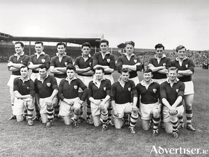This is the Galway football team that played Tyrone in the 1956 All-Ireland semifinal in Croke Park. They are, back row, left to right: Seán Purcell, Gerry Kirwan, Joe Young, Jack Kissane, Frank Evers, Mattie McDonagh, Tom McHugh, and Billy O’Neill. In front are Mick Greally, Tom ‘Pook’ Dillon, Sean Keely, Jack Mangan, Frank Stockwell, Jack Mahon, and Gerry Daly. The first score in the game was a brilliant point by Galway’s Tom McHugh. Galway won a thrilling close game that featured a high degree of sportsmanship, and went on to beat Cork in the final.