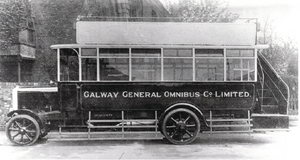 Our photograph today shows a Karrier double-decker bus which was operated by the Galway General Omnibus Company. It was taken at the Spring Show in the RDS in 1924, before it went into revenue earning service. The side panel carries the name of the company, but not the crest. The small lettering on the chassis below the word ‘Galway’ reads ’12 m.p.h.’ A major problem with this type of vehicle was its chain drive which frequently slipped off and caused breakdowns. The bus had solid-tyred wheels and was uncomfortable to ride in.