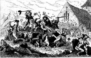 I do not think that it is a coincidence that the famous Galway Races coincide with the ancient festival of Lughnasa, celebrated on Garlic (Garland?) Sunday or, in the west, on the last Sunday in July. Máire Mac Neill, in her epic and scholarly study*, tells us that the date marked the most important farming benchmark of the year, the harvest, and it was robustly honoured. There were many Lughnasa gatherings throughout Ireland. Perhaps the most famous one in Connemara was at Mám Éan in the Maamturk mountains. People would camp out for days, musicians and hawkers would entertain the crowds; but the main event was a massive faction fight often resulting in serious injury or death.